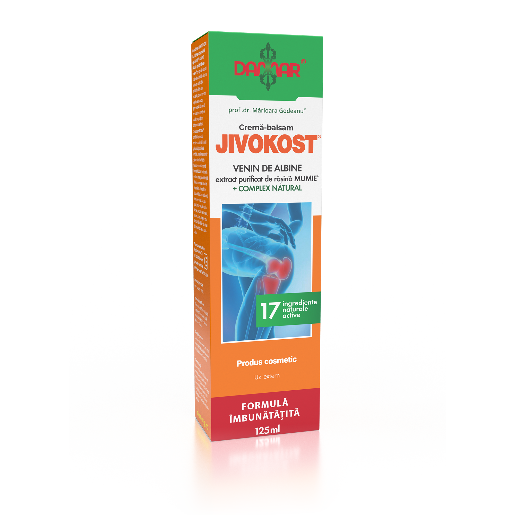 Crema-balsam JIVOKOST VENIN DE ALBINE, extract purificat de răşină Mumie® + COMPLEX NATURAL – prof. dr. Marioara Godeanu® este special concepută astfel încât să contribuie eficient la menţinerea sănătăţii articulaţiilor şi muşchilor. Având o formulă unică din 17 ingrediente naturale rare şi cu o biodisponibilitate ridicată, Crema-balsam JIVOKOST® contribuie la protecţia şi menţinerea confortului la nivelul articulaţiilor şi muşchilor, la reducerea disconfortului articular şi muscular şi la o mobilitate sporită.